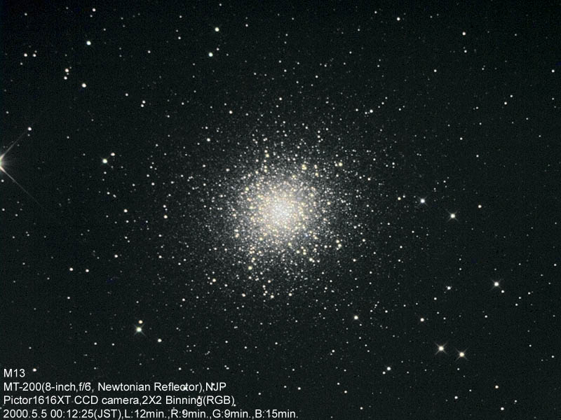 The Butterfly is estimated to be about 100 million years old, M13 is estimated at about 10 BILLION years old, making it so old that it formed before the disk of the Milky Way galaxy formed! While the Butterfly cluster has maybe 100 stars in it total, M13 has no less than 1 million stars. The Butterfly cluster is about 1200 light-years away and about 20 light-years across, M13 is 20,000 light-years away and 160 light-years across.