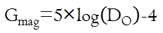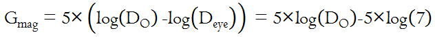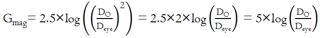 Ok so we were supposed to be talking about your telescope so let's get back to that. We've already worked out the brightness increase we get from the scope as GL = (DO/Deye)², so all we need to do is take 2.5×log(GL) and we have the brightness increase of the scope in terms of magnitudes, so it's just Gmag = 2.5×log((DO/Deye)²).