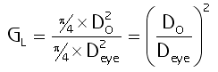 The area of a circle is found as π/4 × D2, so the light grasp -- we'll call it GL -- is the ratio of the area of the objective to the area of the pupil of the eye, which is