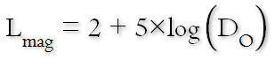 Lmag | Star magnitude limit. The faintest star you can see in the scope, expressed in terms of star magnitude. The majority of visible stars have magnitudes in the range of 1-6, where the brightest stars have the lowest magnitude number, near 1, and the faintest you can see by eye are magnitude 6. The scope can show stars as faint as magnitude 16 or even higher (i.e. fainter), depending on its diameter. |