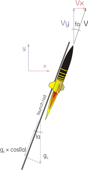 There's one other trick -- handling the effect of the launch rod during the initial launch. The launch rod only allows forces, like gravity, to act along the axis of the rod. Since the rocket is aligned with the rod, the full thrust is seen along that axis. The component of gravity that is perpendicular to the rod is supported by the rod, so only the component along the axis of rod acts on the rocket during this phase. This would be gc*cos(la), where la is the launch angle. Because this is no longer vertical, there is a horizontal and vertical component, so the horizontal component is gx = gc*cos(la)*sin(la) and the vertical component is gy = gc*cos(la)*cos(la) = gc*cos(la)^2. Then until the rocket reaches the end of the launch rod, I handle this in the spreadsheet by defining gx & gy as above until the rocket's travel exceeds the length of the launch rod, then past that point, gx = 0 and gy = gc. |