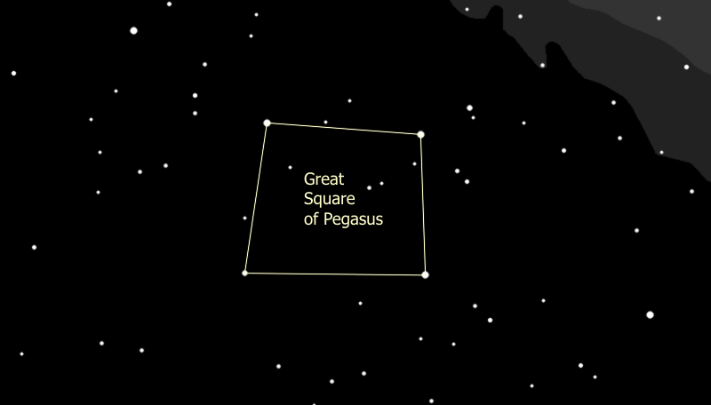 The autumn sky is dominated by the Great Square of Pegasus, four stars that form a huge square in the sky, which you can see if you look almost straight up. See it? The stars are a bit faint, but it's distinctive because it's in a faint portion of the sky. The earth has swung around the sun to the southern face of our galaxy so we are now looking out of the disk of the galaxy towards its south pole. As a result, the region of the Great Square has few nearby bright stars. If you follow a straight line through the two stars on the right side of the square up over the top of the sky and back down, it takes you to the North Star.