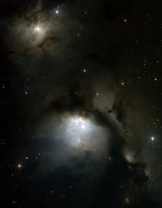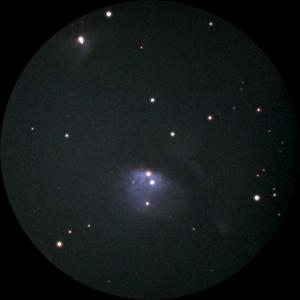 This nebula is remarkably clear in a telescope, binoculars, or even to the fiercely concentrated eyeball. The longer you look, the more detail you can see. Notice in the telescope how the nebula forms the shape of a ghostly bat. Look very carefully at the bright star at the center of the nebula. It's not just one star, it is actually FOUR! In fact these four stars have a special name, they are called "The Trapezium". It is their energy that lights up the nebula.
