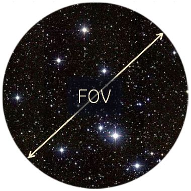 If you hold up your eyepiece by itself and look through it, assuming you don't go cross-eyed trying, you will see that there is an upside-down image. The width of that image, measured as an angle, is the field of view of the eyepiece. Typically, an eyepiece has a field of view of 50-60°, although there are wide-field eyepieces that go up to as much as 82° (and higher -- I just saw one that has a field of 100°!).